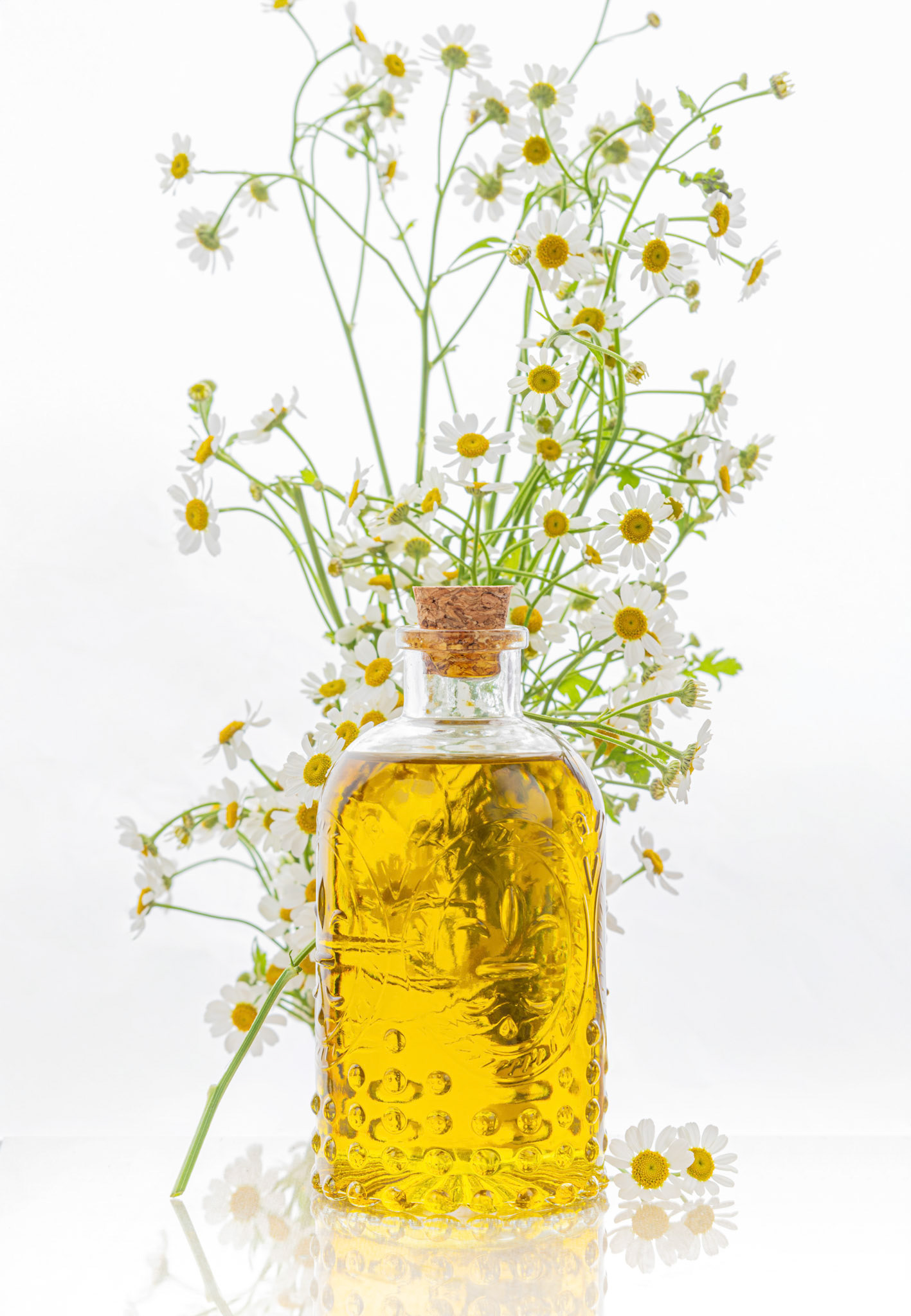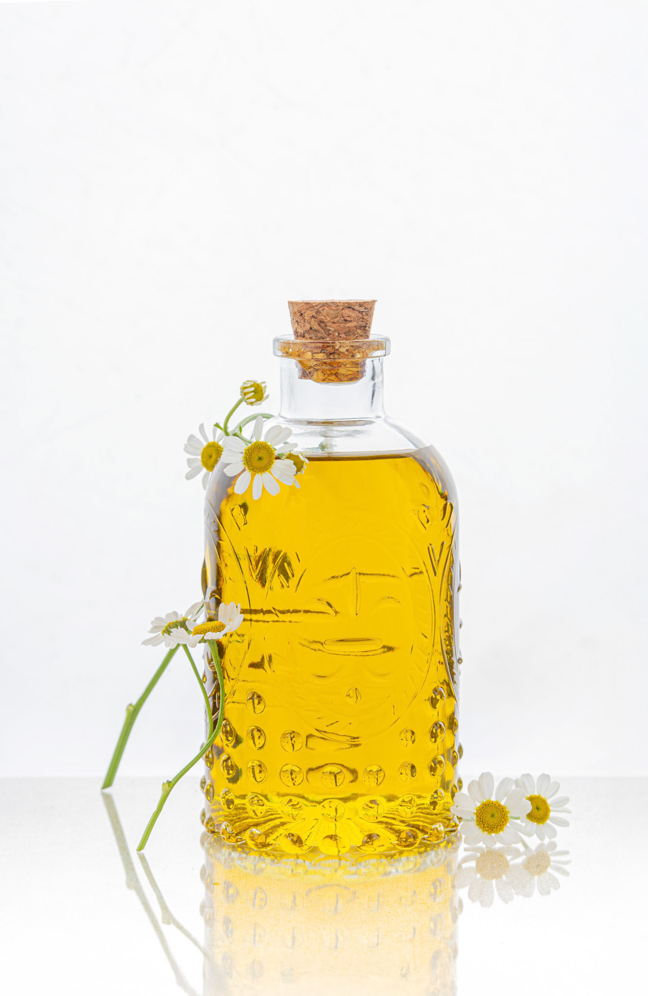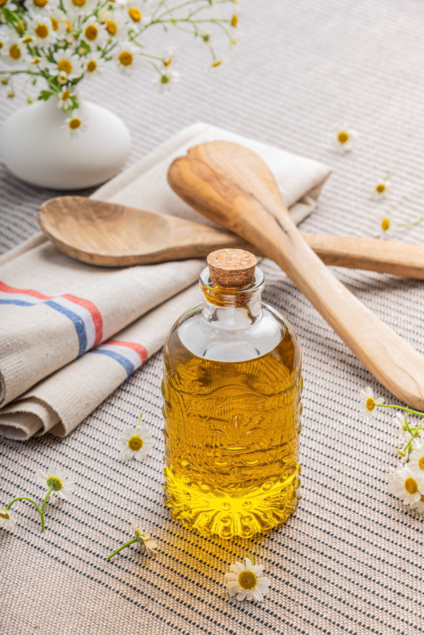 A premium, small-batch chamomile-infused olive oil, rooted in the heritage and slow-production methods of the French countryside. The Concept: This editorial explores the sensory process of "infusion”. The floral design moves away from traditional rustic elements, focusing instead on the singular elegance of the chamomile flower. We staged the visuals to highlight the contrast between the delicate, airy blooms and the rich, golden viscosity of the oil. Through minimalist styling and making use of natural textures, the design alludes to the product’s role in the kitchen. The focus is on movement and immersion, capturing the simplicity of the raw ingredients to tell a story of craftsmanship, intentionality, and the artisanal spirit of southern France.
